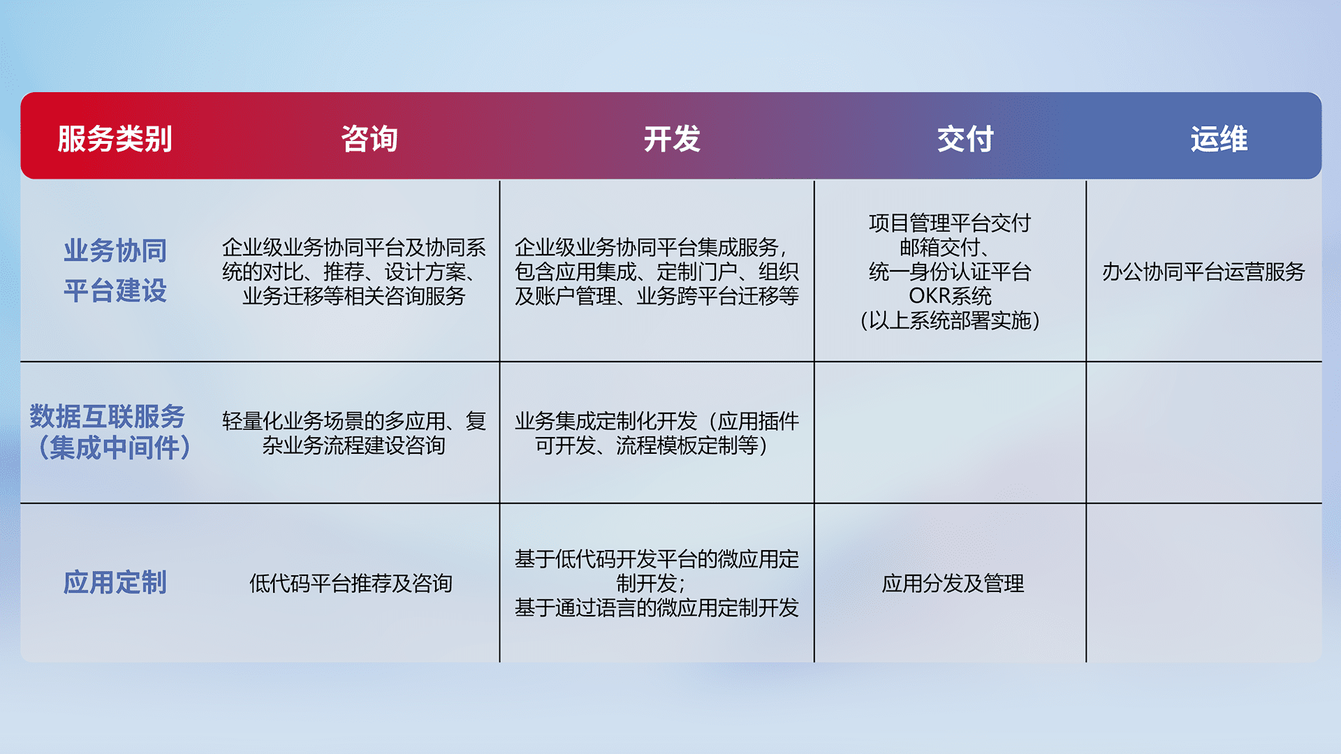 针对钉钉、、企微、、、、IDaas等平台级产品提供产品的规划、、、方案、、、交付、、、、定制化开发等服务,,,,实现如统一协同办公、、、、智能客户服务、、、、混合会议管理、、、智能数据查询、、、等业务场景,,,,实现数字化转型。。。